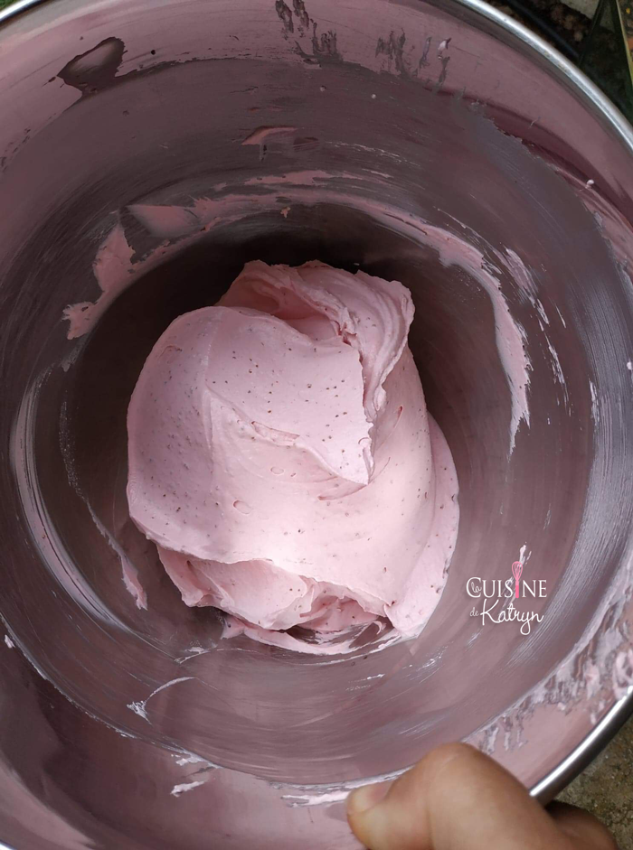 • Faites fondre le chocolat blanc au bain-marie puis placez dans un recipient. Versez la crème chaude sur le chocolat et mélangez avec une maryse. Puis versez la crème froide (2) et mélangez à nouveau le tout en commençant par le centre vers les extrémités. Lorsque le mélange est homogène et bien lisse, ajoutez le coulis de fraises puis le colorant (facultatif mais efficace pour une jolie couleur). Filmez le récipient d’un film alimentaire et placez au frais une nuit. Idéalement placez aussi le bol et le fouet du robot.