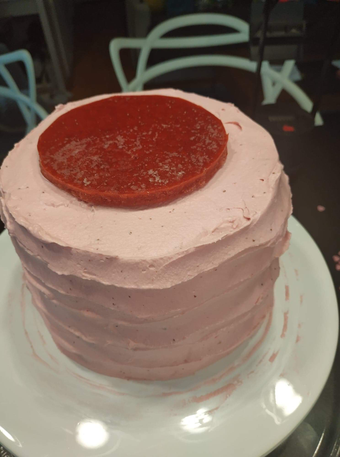 • déposez le coulis congelé sur le dessus du layer Cake, découpez vos fraises, disposez-les...