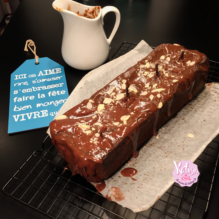 • Faîtes fondre le chocolat au bain-marie. Une fois bien fondu ajoutez la crème, mélangez et nappez aussitôt le cake froid. Parsemez de quelques amandes effilées.