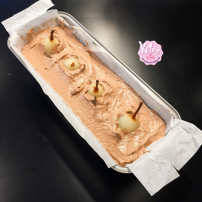 • Versez la préparation dans un moule rectangulaire que vous aurez au préalablement chemisé au beurre et farine. Déposez les poires égouttées dans la pâte en les enfonçant. Attention évitez si possible de casser les queues.