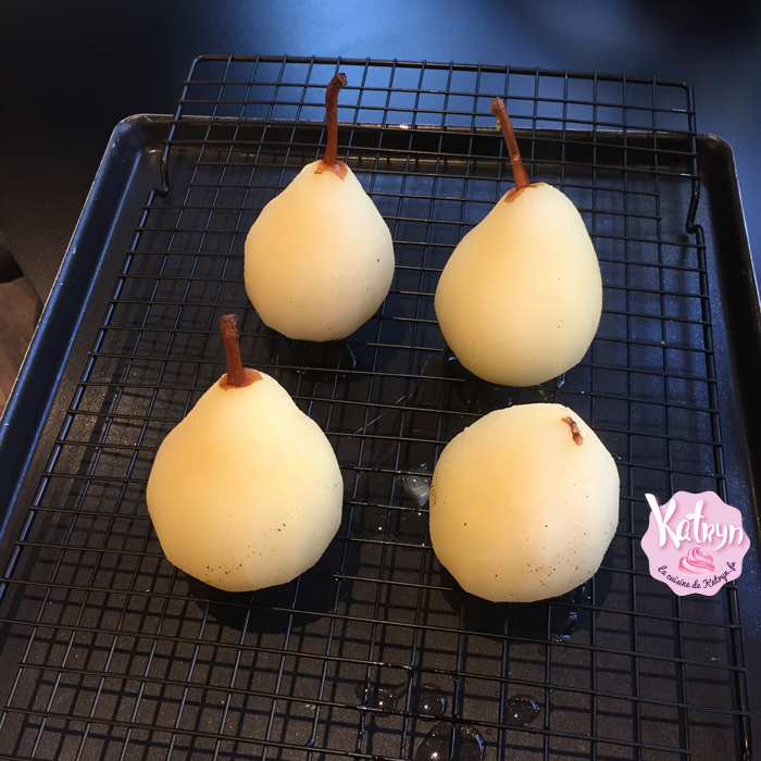 • Pendant ce temps, Épluchez les poires en conservant la queue. A l'aide de la pointe d'un couteau, enlevez le fond du fruit sans retirer le cœur pour éviter un affaissement des poires à la cuisson. Certe c'est moins agréable à la dégustation que sans le cœur, à vous de voir !