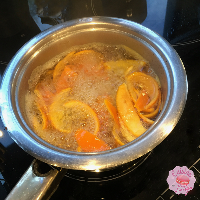 • Plongez les écorces dans une casserole remplie d’eau froide. Portez à ébullition. Égouttez et rincez les fruits. Renouveler l’opération deux autres fois afin d’enlever l’amertume des écorces.