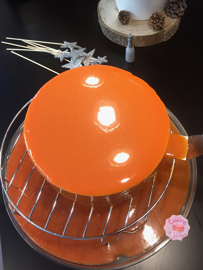 • Démoulez l'entremet après une nuit au congélateur, déposez un pot de conserve sur une grille. Posez l'entremet sur le pot de conserve et versez le glaçage à une température entre 26°C et 28°C (pas plus si non votre entremet va fondre). Faites votre déco.