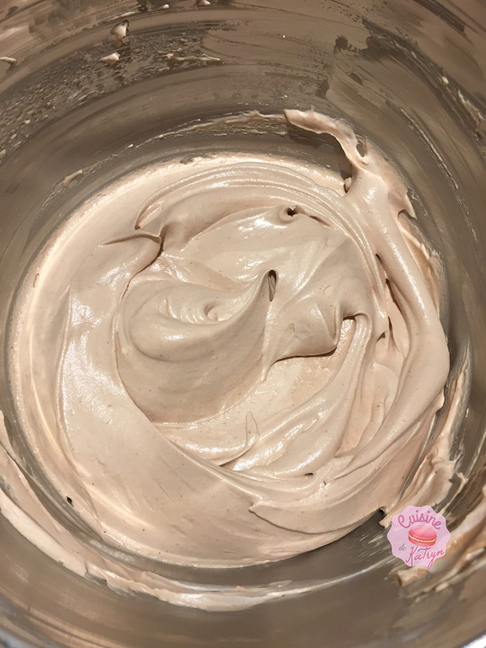 • Faîtes fondre le chocolat au bain-marie puis mélangez tous les ingrédients, délicatement. Mettez une fine couche sur la dacquoise.
