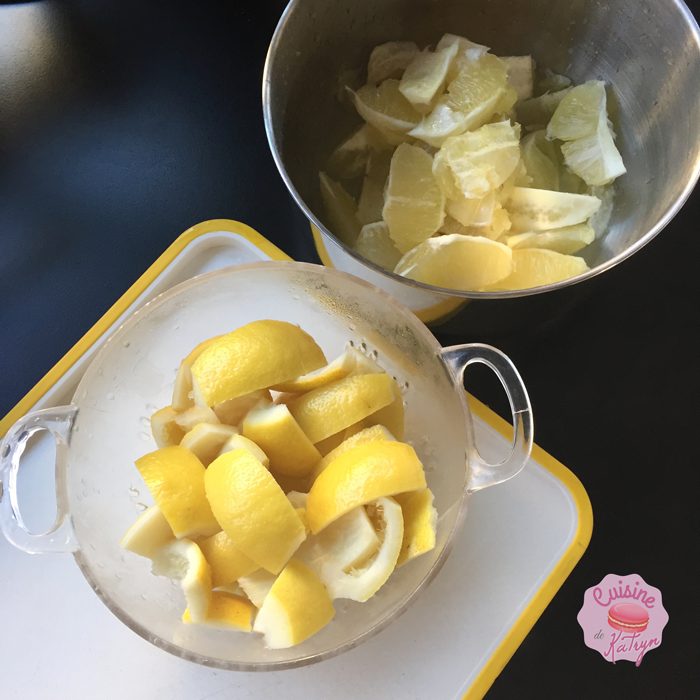 • Coupez les citrons en huit puis retirez avec un épluche économique le ziste (la partie blanche). Pressez la chaire des citrons et conservez le jus pour la suite de la recette.