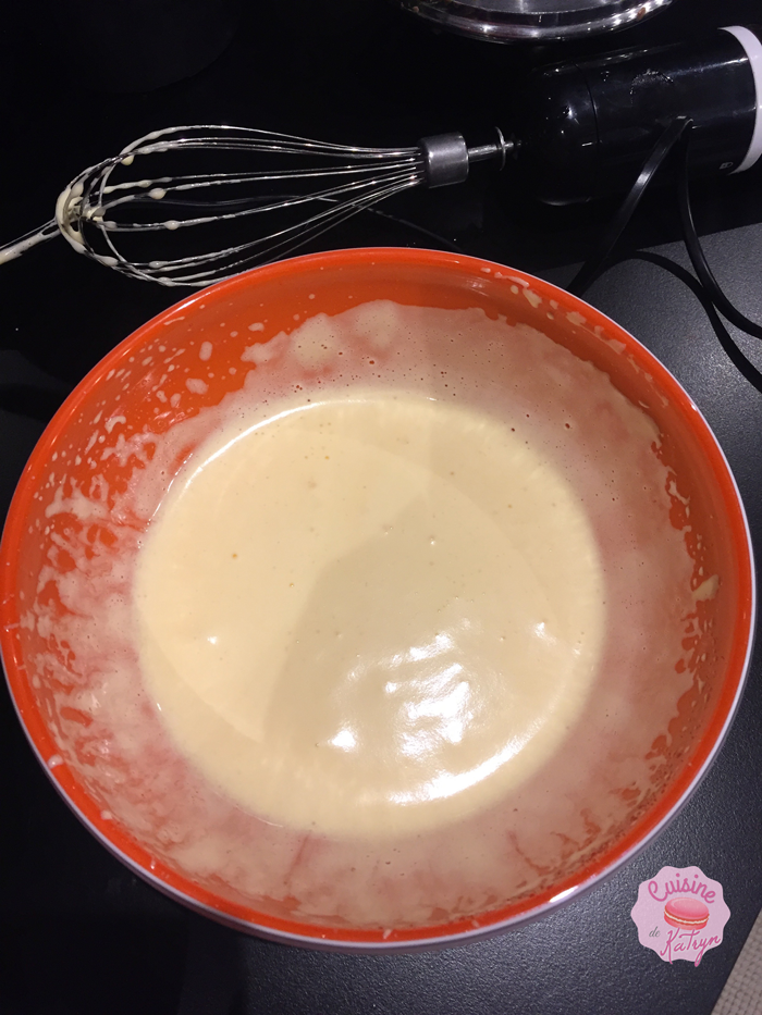• Fouettez les œufs et versez le jus tiède peu à peu sur les oeufs tout en fouettant pour ne pas cuire les oeufs, puis transvasez le tout dans la casserole. Cuire jusqu’au premier bouillon. Hors du feu, incorporer la gélatine essorée.