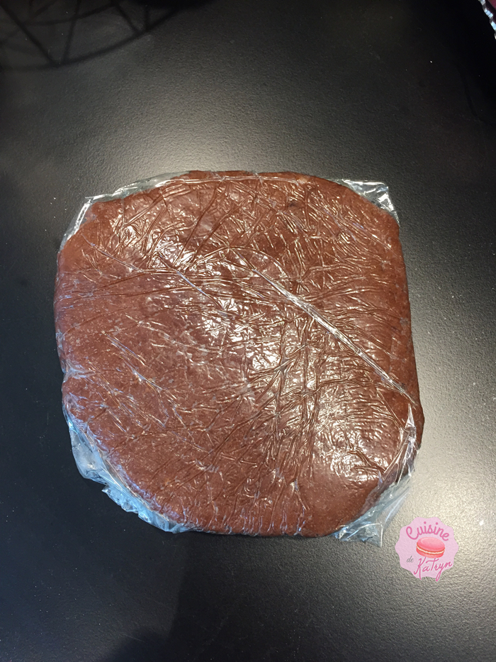• Enveloppez la boule de pâte de film alimentaire puis aplatissez-la de la paume de main, elle refroidira plus vite. Laissez-la durcir au minimum 1 heure au réfrigérateur.