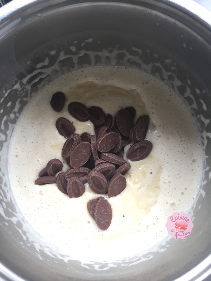 • Mettez la préparation dans une grande casserole sur feu moyen sans cesser de fouetter. Dès que la crème épaissie et commence légèrement à bouillir, retirez-la du feu. Incorporez hors du feu le chocolat, bien mélanger et laissez un peu refroidir.