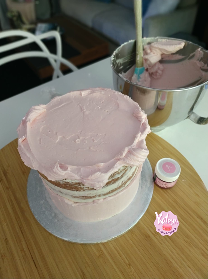 • Etalez une belle couche de crème au beurre cette fois-ci, et lissez le mieux possible. Placez-le à nouveau au frais, et seulement après vous rectifierez les petites imperfections avec du papier cuisson... Mais pour cela il faut que la CBMS soit dure.