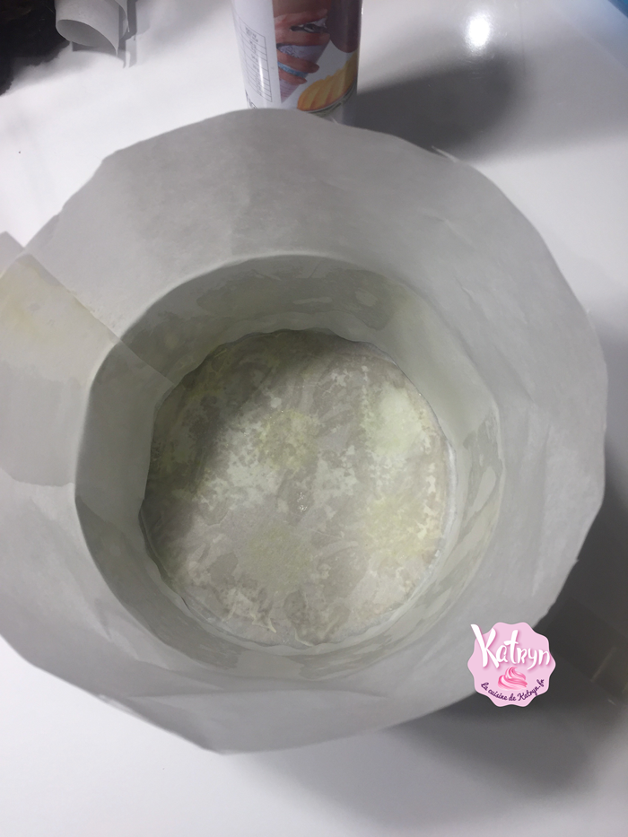 • Pendant ce temps là, chemisez votre moule. Badigeonnez le moule de graisse, (moi j'utilise une bombe) et déposez du papier cuisson qui va s'adhérer très facilement.