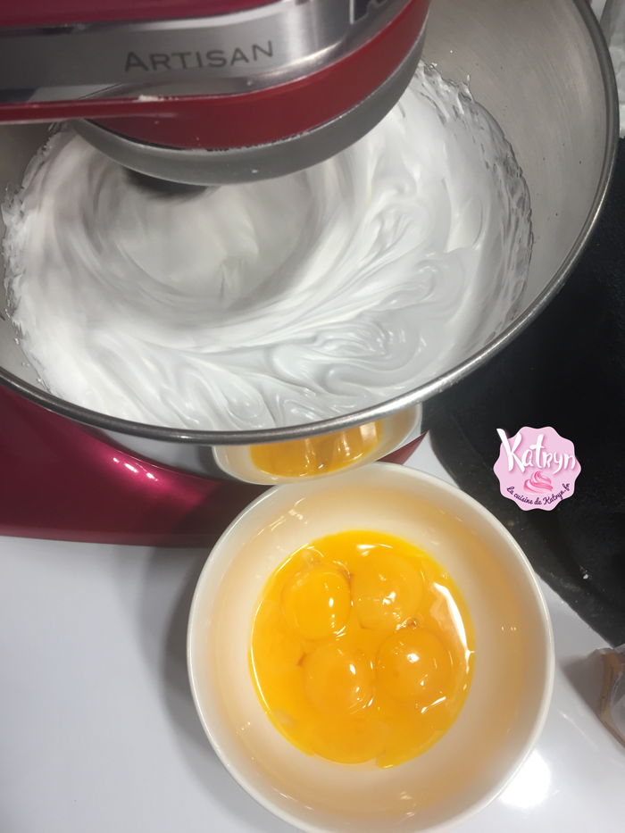 • Ajoutez un à un les jaunes d'oeufs tout en fouettant à petite vitesse.