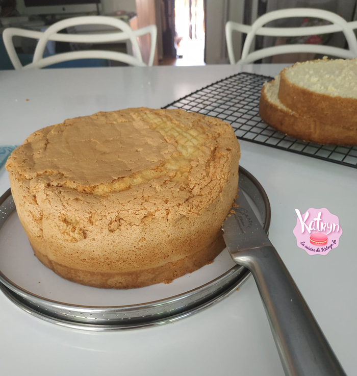 • Une fois froide et passée au réfrigérateur, coupez la génoise comme sur la photo, puis imbibez votre génoise avec un sirop.