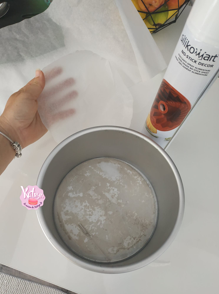 • Pendant ce temps là, chemisez votre moule. Badigeonnez le moule de graisse, (moi j'utilise une bombe) et déposez du papier cuisson qui va s'adhérer très facilement.