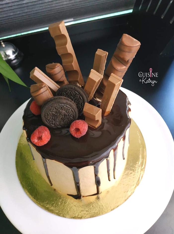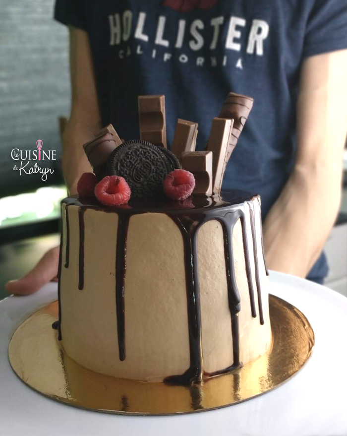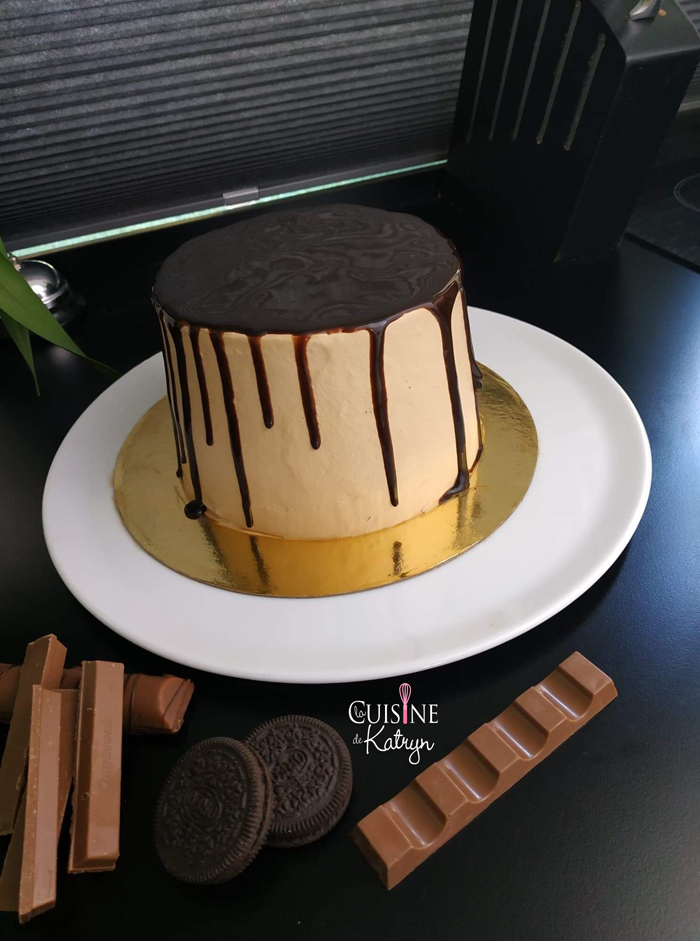 • Faites fondre au bain marie le chocolat avec le beurre. Laissez refroidir à température ambiante puis versez sur le layer cake bien froid quand votre chocolat atteint 22°c, vous aurez de belles coulures (ne faites pas comme moi qui ait versé alors qu'il était tout juste à 30°c).