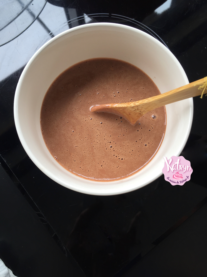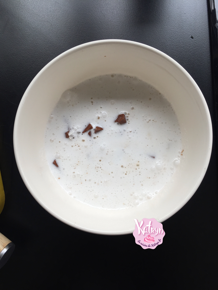 • Faites chauffer le lait de coco sans la faire bouillir et l’ajoutez en 2 fois au chocolat pratiquement fondu, laissez infuser 1 minute. Mélangez à l'aide d'une marise après chaque ajout pour bien homogénéiser la ganache.