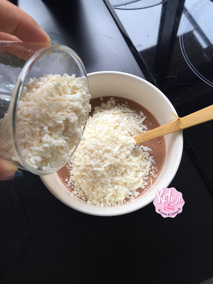 • Faites baisser la température à 40°C avant d'incorporer le beurre en petit morceau. Mélangez à la marise jusqu'à une totale absorption puis incorporez les copeaux de coco.