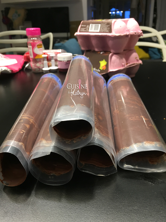 • Faites fondre au bain marie le chocolat et badigeonnez une feuille plastifié (comme un intercalaire par exemple si vous n'avez rien). Roulez et laissez refroidir au frigo.