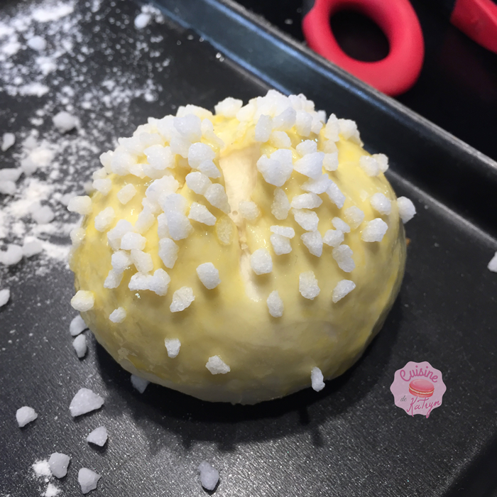 • Les dorer au pinceau avec le mélange jaune d’œuf et lait, parsemer de sucre perlé et enfourner 15 minutes à 180°C.