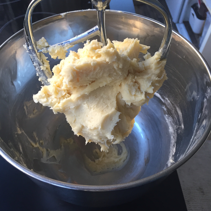 • Versez le beurre à température ambiante coupé en morceaux et la farine ensemble dans le bol d’un robot pétrisseur muni de la feuille, vitesse 1 jusqu’à ce qu'elle soit homogène. Finissez-la à la main si besoin.